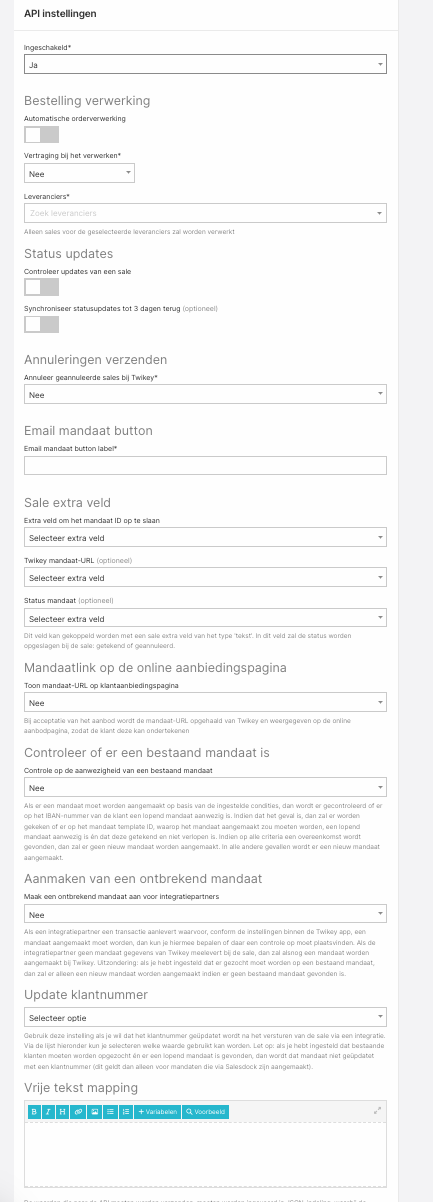9. Maak een ontbrekend mandaat aan voor integratiepartners: als je samenwerkt met integratiepartners (via een Salesdock integratie of API), dan kun je het mandaat laten aanmaken op jouw Salesdock omgeving indien er geen mandaat is aangemaakt. Bij Salesdock integraties wordt er gecontroleerd of er Twikey mandaat gegevens zijn meegestuurd met de sale; indien dat het geval is, dan wordt er geen nieuw mandaat aangemaakt. Voor sales aangemaakt via de API zal er altijd een mandaat worden aangemaakt indien je deze instelling op 'Ja' zet.